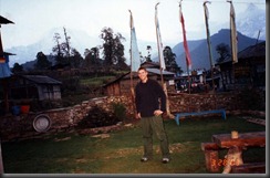 I read in the guidebook that I was supposed to pay for entry. It did not seem too hard to just pass that by as I did not know anywhere or anyone I was supposed to pay. Oh well, just continue on up the hill. What is the worst thing that could happen? The forest continued to recede as I climbed farther toward Namche Bazaar. My pace was slowing down, but I was still holding my own with the porters. Eventually, I popped out and there was Namche. It was a fairly large town and walking the streets there were lots of people hanging around. My dad having made the trip just recently allowed me to get good information on where to stay. I went to tea house up the hill. They treated me like royalty. It was weird as I was just a 22 year old kid really. I was able to drop my stuff off, get some lunch, and then head out to explore the town. I looked at the bookstore and prices were relatively reasonable. The way to go is to trade another book in and then you can get a reduced rate. I went up the hill to a sort of museum place where I read that I could also pay my entry fee. It seemed abandoned as it was empty there. I was able to wander around and look at the exhibits. I was not much of a shopper, so going around town lost interest for me pretty quick. I spent some time reading and hanging out in the common area of the tea house. There was a lot going on with expeditions coming through. I talked to most people I saw. Some were friendly, especially if they were not with a tour group. The tour group people tended to bond with one another. It was also interesting to me that here I was in the Himalayas and in the common area, there was a TV going with CNN playing on it. I got updates on how things were going in the Iraq War. It seemed like this was going to be over soon. That was good as I did not know how to deal with it being an American overseas. It definitely was not as lonely here as modern life made me feel a little more comfortable. There were lots of people around too. Still, I turned in rather early as usual. I figured this was going to be a good place to get some rest. It would be a quiet day tomorrow as I needed to let my body catch up to the change in altitude.