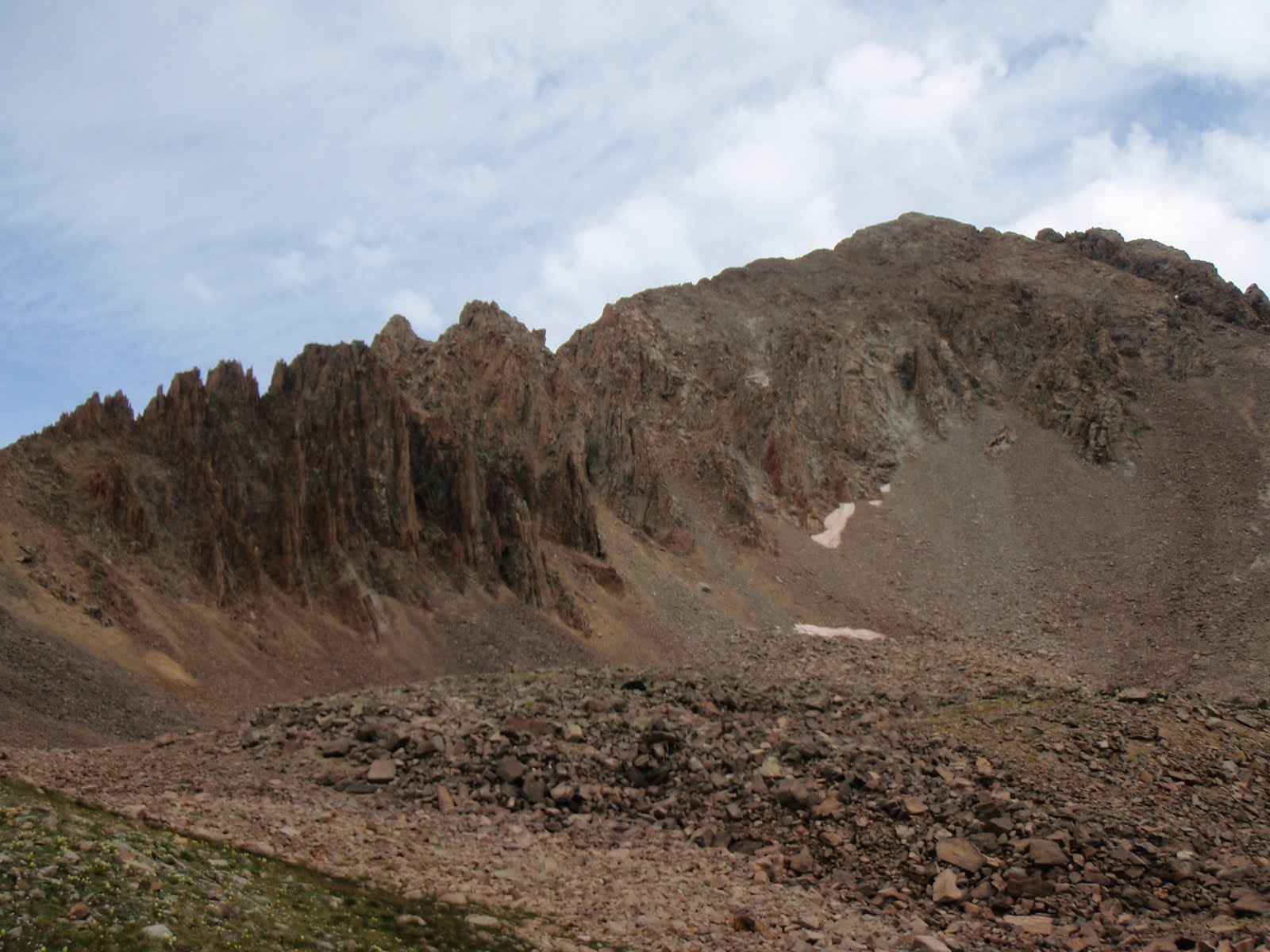 I was actually a little bit wrecked in the nerves when I finally got to the Blue Lakes Pass. This put me right at a great vantage point to check out Mt. Sneffels. I could not figure out what was the right way to go from here. There was a jagged ridge that climbed directly above where I was and there also looked to be a steep scree slope on the other side of the mountain. My three choices were to either climb the ridge directly in front of me, go down and climb the scree slope, or go back from where I came and say screw climbing this peak on this day. I chose option 1 after considering each one after I saw a party with yellow helmets climbing above me. I figured I would follow them.